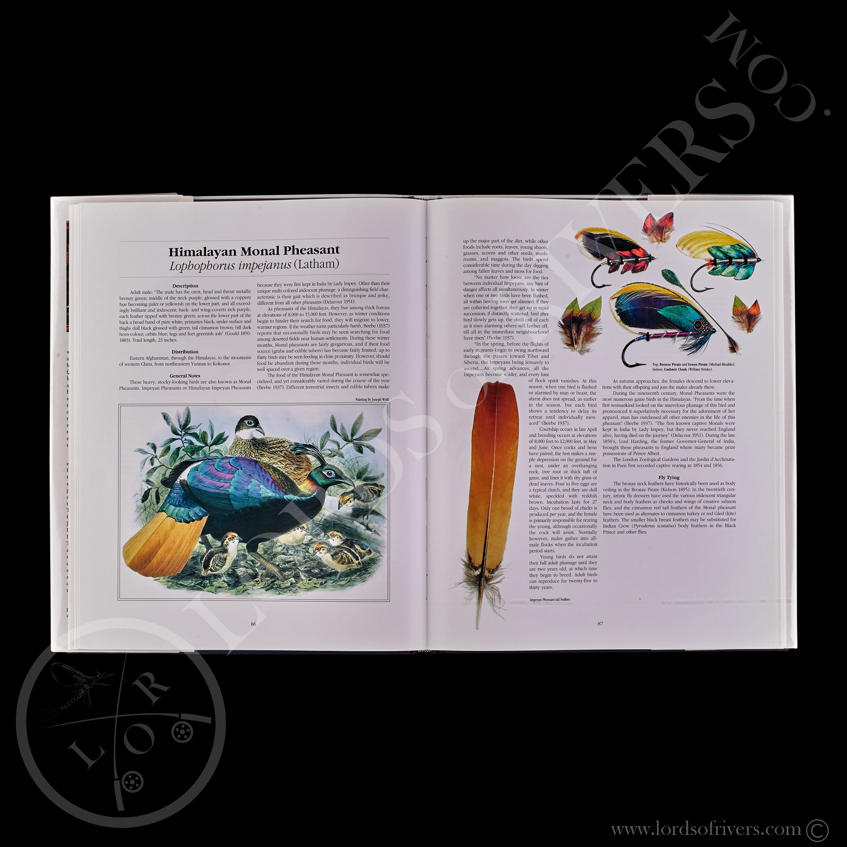 "Traiter à la fois les matériaux standards et rares, leurs sources et leur géographie, tels qu’ils sont utilisés dans les truites et les mouches à saumon classiques, contemporains et artistiques, exposés sur des photographies et dans les peintures et gravures des plus grands illustrateurs ornithologiques et zoologiques de l’histoire." « Les illustrations des oiseaux, alliant excellence artistique et précision anatomique, ont été choisies parmi les meilleurs exemples d’œuvres des artistes des XVIIIe et XIXe siècles. Chaque magnifique tableau est accompagné d’une brève histoire naturelle de l’oiseau, d’une description du plumage utilisé dans l’habillage des mouches et d’une photographie détaillée des plumes. Cela s’accompagne de photographies de mouches anciennes, classiques, contemporaines et créatives, attachées par certains des rangs les plus doués du siècle dernier. »