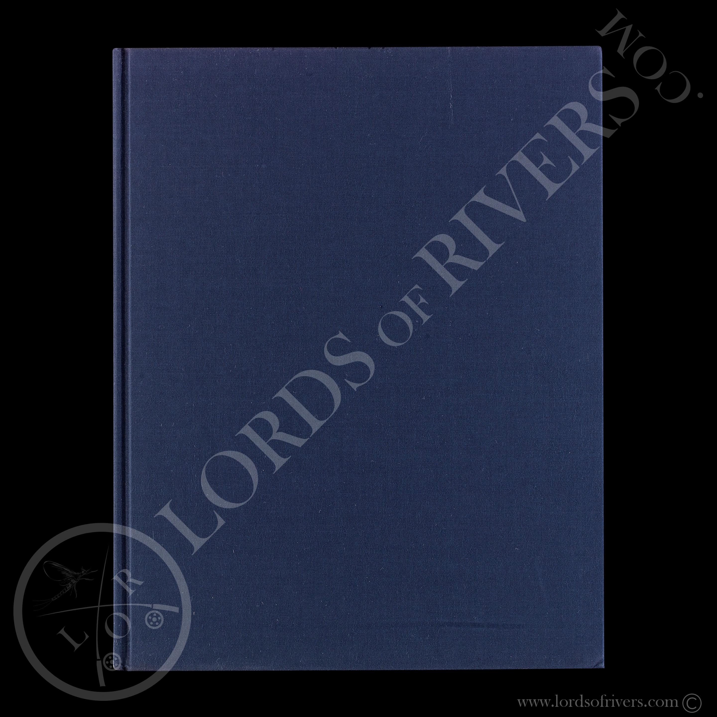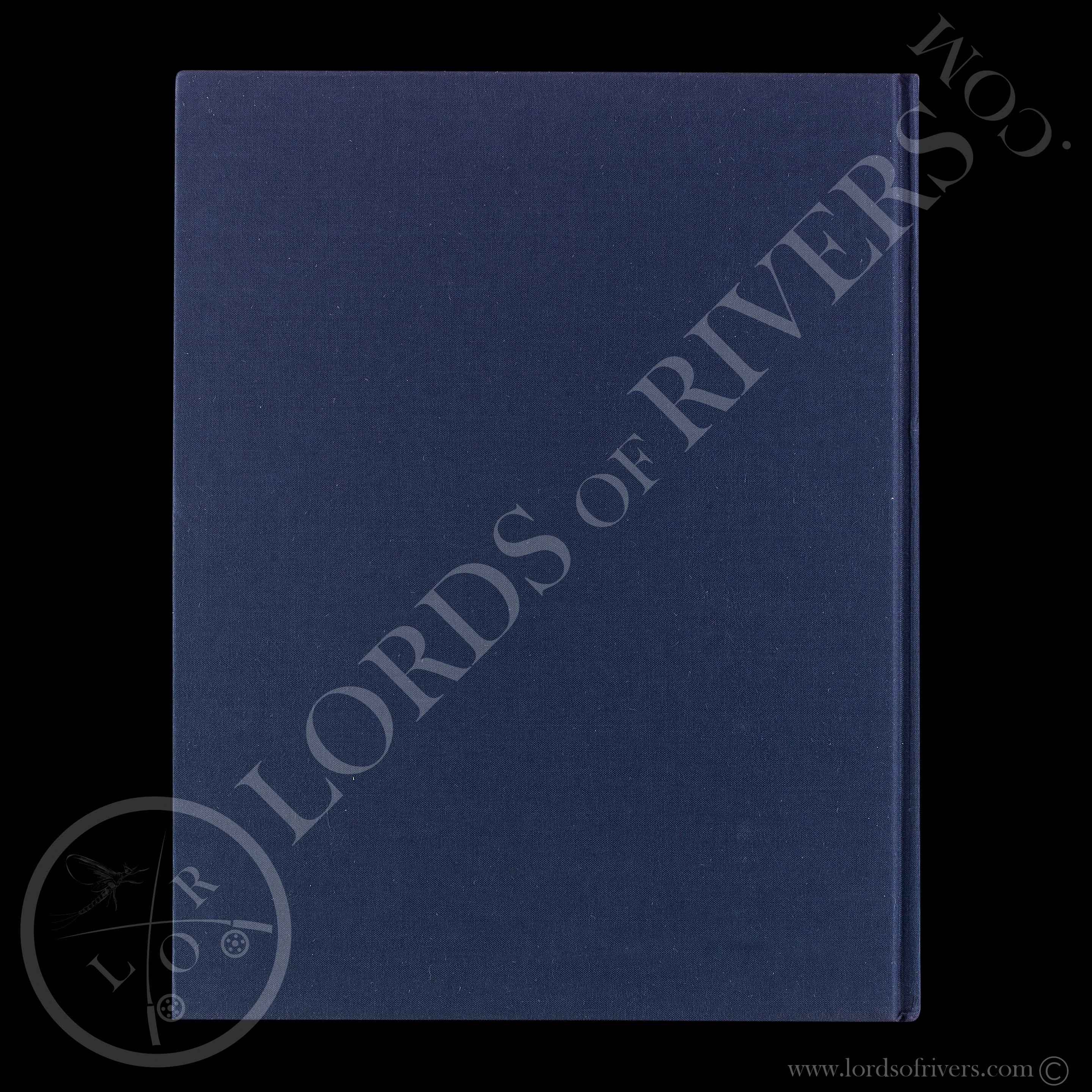 Tissu bleu foncé, épine titrée en doré.